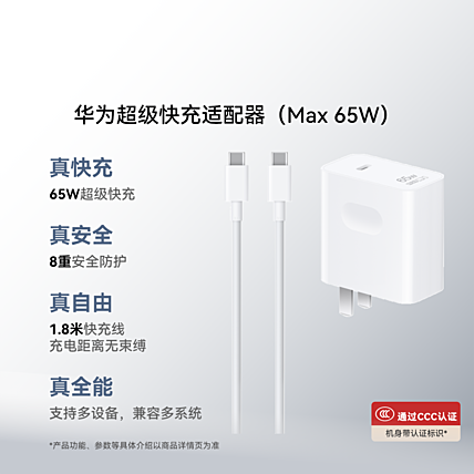 华为 超级快充多设备电源适配器 (Max 65W) 小巧便携口袋充电器 适配鸿蒙笔记本 华为手机 华为平板1.8米线【3C认证】